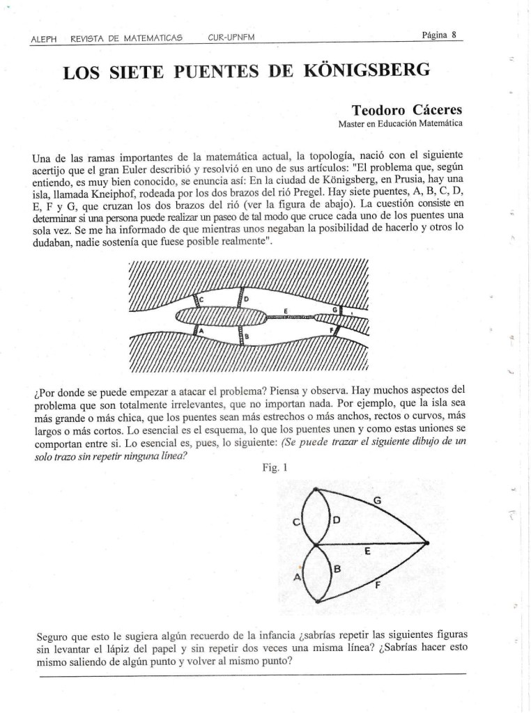 Una de las ramas importantes de la matemática actual, la topología, nació con el siguiente acertijo que el gran Euler describió y resolvió en uno de sus artículos: «El problema que, según entiendo, es muy bien conocido, se enuncia así: En la ciudad de Königsberg, en Prusia, hay una isla, llamada Kneiphof, rodeada por los dos brazos del río Pregel. Hay siete puentes, A, B, C, D, E, F y G, que cruzan los dos brazos del río (ver la figura de abajo). La cuestión consiste en determinar si una persona puede realizar un paseo de modo que cruce cada uno de los puentes una sola vez. Se me ha informado de que mientras unos negaban la posibilidad de hacerlo y otros lo dudaban, nadie sostenía que fuese posible realmente».