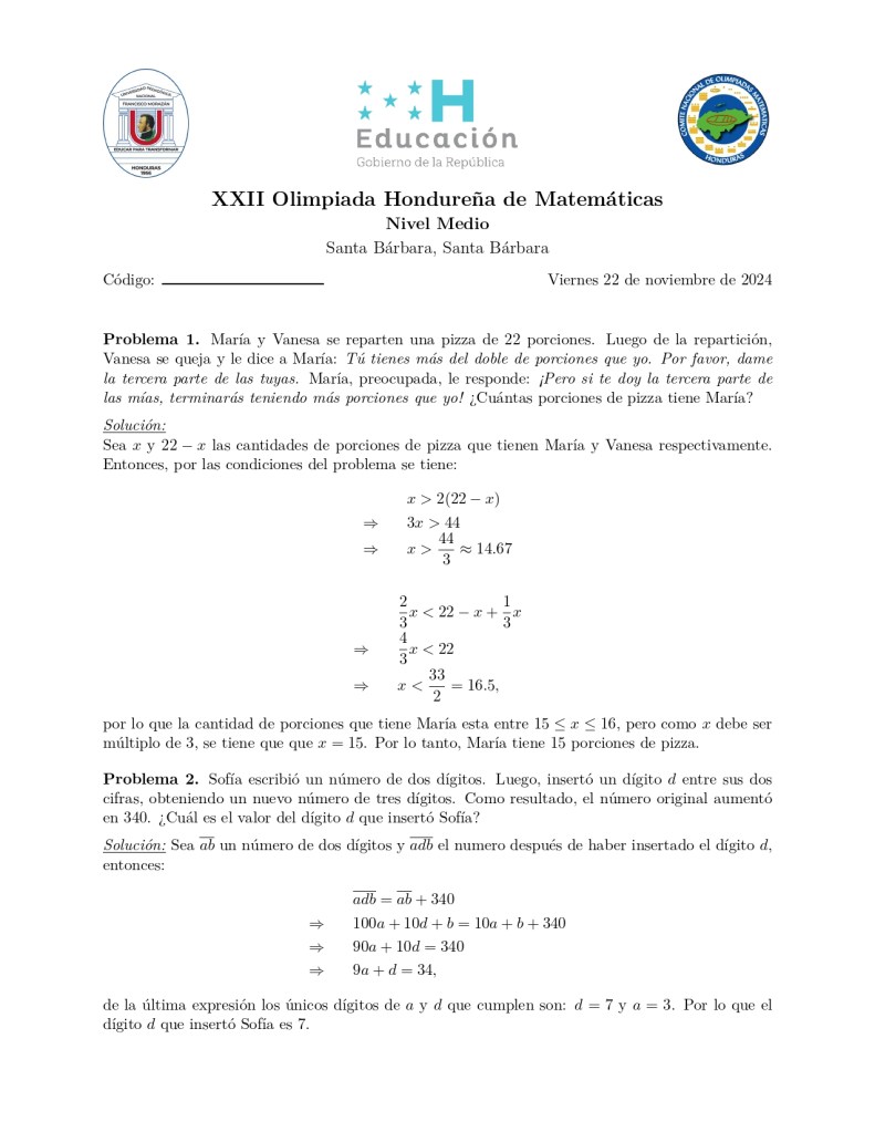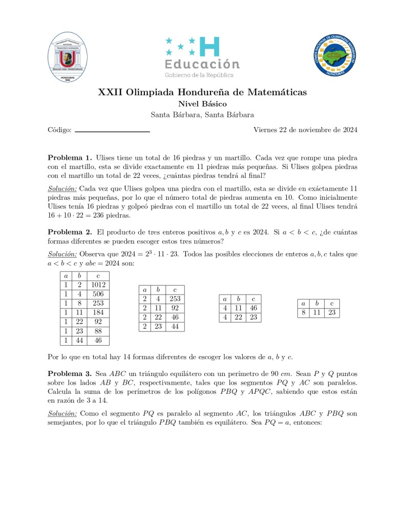 En este página se presentan las soluciones el examen aplicado en la XXII Olimpiada Hondureña de Matemáticas, se desarrolló en 2 niveles.